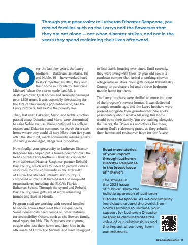 ELCA.org/disaster | 11Over the last few years, the Larry brothers %u2014 Dakarian, 25; Mario, 19; and Noble, 10 %u2014 have worked hard to stick together. In 2018, they lost their home in Florida to Hurricane Michael. When the storm made landfall, it destroyed over 1,100 homes and severely damaged over 1,800 more. It was especially devastating for the 17% of the county%u2019s population who, like the Larry brothers, live below the poverty line.Then, last year, Dakarian, Mario and Noble%u2019s mother passed away. Dakarian and Mario were determined to raise Noble even as Mario continued his college classes and Dakarian continued to search for a safe home where they could all stay. More than five years after the storm hit, many community members were still living in damaged, dangerous properties.Now, finally, your generosity to Lutheran Disaster Response has helped put a brand-new roof over the heads of the Larry brothers. Dakarian connected with Lutheran Disaster Response partner Rebuild Bay County, which was founded to provide critical resources for the community in the aftermath of Hurricane Michael. Rebuild Bay County is composed of over 150 faith-based and nonprofit organizations, including the ELCA%u2019s FloridaBahamas Synod. Through the synod and Rebuild Bay County, your gifts are at work rebuilding homes and lives in Florida.Program staff are working with several families to secure homes that meet their unique needs. Some households need ramps or other features for accessibility. Others, such as the Bowers family, need space for kids. The Bowerses are a young couple who lost their home and their jobs in the aftermath of Hurricane Michael and have struggled to find stable housing ever since. Until recently, they were living with their 10-year-old son in a rundown camper that lacked a working shower, refrigerator or stove. Your gifts helped Rebuild Bay County to purchase a lot and a three-bedroom mobile home for them.The Larry brothers were thrilled to move into one of the program%u2019s newest homes. It was dedicated a couple months ago, and the Larry brothers were present alongside their grandmother. She spoke passionately about what a blessing this home would be to their family. You are walking alongside the Larrys, the Bowerses and others like them, sharing God%u2019s redeeming grace, as they rebuild their homes and rediscover hope for the future.Read more stories of your impact through Lutheran Disaster Response in the latest issue of %u201cThrive%u201d!The stories in the 2025 issue of %u201cThrive%u201d show the holistic approach of Lutheran Disaster Response. As we accompany individuals around the world, from North Carolina to Ukraine, your support for Lutheran Disaster Response demonstrates the value of our relationships and the impact of our long-term commitment. Rebuilding homes and lives Through your generosity to Lutheran Disaster Response, you remind families such as the Larrys and the Bowerses that they are not alone %u2014 not when disaster strikes, and not in the years they spend reclaiming their lives afterward.